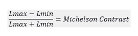 Michelson Contrast can be defined as the overall visibility of a pattern or object. Michelson Contrast is found by finding the max luminance and minimum luminance of the object and comparing them using the equation: